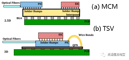 d) 進(jìn)一步的,共封裝CPO方案也可能分為兩個(gè)階段,初級(jí)階段是通過在一層介質(zhì)上把電器件和光器件進(jìn)行2.5D封裝,組成多芯片模組(MCM)。終極目標(biāo)是通過硅通孔實(shí)現(xiàn)3D封裝,真正意義上進(jìn)行單片光、電芯片的封裝。如圖11所示。