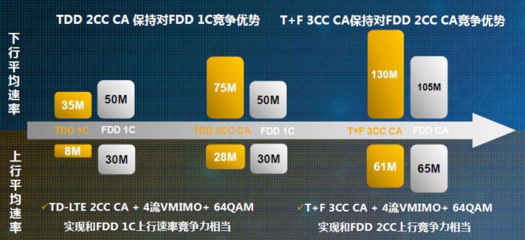 TDD/FDD融合組網(wǎng)對于中國移動有著多重的重要性:其一,只有TDD/FDD融合組網(wǎng)后結(jié)合載波聚合功能實現(xiàn)130M下行/60M上行才能確保在速率上時時都能領(lǐng)先FDD一步(如圖所示);其二,只有TDD/FDD融合組網(wǎng)才能幫助中國移動擺脫其國際合作伙伴的FDD LTE用戶漫游到中國移動網(wǎng)絡(luò)上無4G可用的尷尬境地;其三,隨著移動寬帶步入物聯(lián)網(wǎng)時代,當(dāng)寬帶由人的連接發(fā)展到“人+物”的連接,TDD(時分雙工)技術(shù)適應(yīng)非對稱業(yè)務(wù)的優(yōu)勢會由于上行受限而變成劣勢,所以TDD/FDD融合組網(wǎng)是必然趨勢。