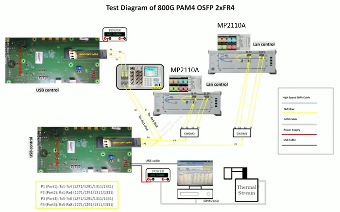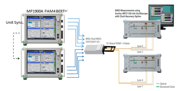 安立公司作為領(lǐng)先的光通信測試解決方案提供商,積極開展與IEEE以及OIF等相關(guān)標準組織以及行業(yè)組織的合作,同時,安立公司也是800G Pluggable MSA和QSFP-DD800 MSA的成員。為滿足今后800GbE的測試需求,安立公司率先推出了完整的800GbE測試解決方案,為800G產(chǎn)品的開發(fā)和性能驗證提供了完整的測試能力。安立MP1900A是一款高性能、一體化的PAM4誤碼儀,內(nèi)置了抖動、噪聲、CDR、均衡/加重等功能,以及豐富的誤碼測試和分析功能,可同時實現(xiàn)8路接收誤碼測試;通過控制儀表內(nèi)部的壓力信號的注入,可以模擬各種損傷信號的產(chǎn)生,為產(chǎn)品的設(shè)計開發(fā)提供全方位的驗證測試。MP2110A作為一款高性能、緊湊型的采樣示波器,內(nèi)置光時鐘恢復(fù),通過優(yōu)化的GUI界面,實現(xiàn)8X100Gbit/s的8路發(fā)端眼圖并行測試,為產(chǎn)品從研發(fā)到生產(chǎn)提供高效、可靠的測試。安立公司的800G方案(下圖三)覆蓋了光電芯片、器件、模塊的測試需求;從產(chǎn)品的開發(fā)到后續(xù)的規(guī)模量產(chǎn),促進下一代數(shù)據(jù)中心的技術(shù)發(fā)展。