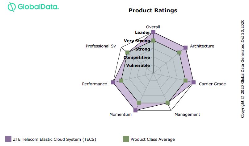 GlobalData在報告中指出,NFVI解決方案現(xiàn)支持虛擬機和容器工作負載,并已基于開源軟件廣泛部署,自動化、分析和預(yù)集成解決方案在運營商有效交付新5G服務(wù)的能力中發(fā)揮著重要作用。該報告從方案架構(gòu)(Solution Architecture)、電信級功能(Carrier Grade Features Supported)、管理(Management)、市場動力(Market Momentum)、性能(Performance)、專業(yè)服務(wù)(Professional Services)六個維度進行了評估,中興通訊TECS產(chǎn)品在架構(gòu)、電信級功能、性能和市場動力四個維度上獲得Leader評級,從而在整體表現(xiàn)上亦斬獲Leader評級。