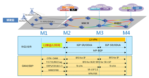 5G中傳和回傳對(duì)于承載網(wǎng)在帶寬、組網(wǎng)靈活性、網(wǎng)絡(luò)切片等方面需求基本一致,因此可以采用統(tǒng)一的承載方案。如上述,為了便于網(wǎng)絡(luò)維護(hù)和降低設(shè)備的復(fù)雜度,建議將三層網(wǎng)絡(luò)(L3)功能部署到接入?yún)R聚節(jié)點(diǎn)(M2),中國(guó)電信將此類設(shè)備命名為路由增強(qiáng)型OTN設(shè)備(簡(jiǎn)稱為增強(qiáng)型OTN設(shè)備)。接入層節(jié)點(diǎn)(M1)可通過(guò)各種方式連接到M2節(jié)點(diǎn)。基于OTN的中/回傳技術(shù)方案如圖2所示。