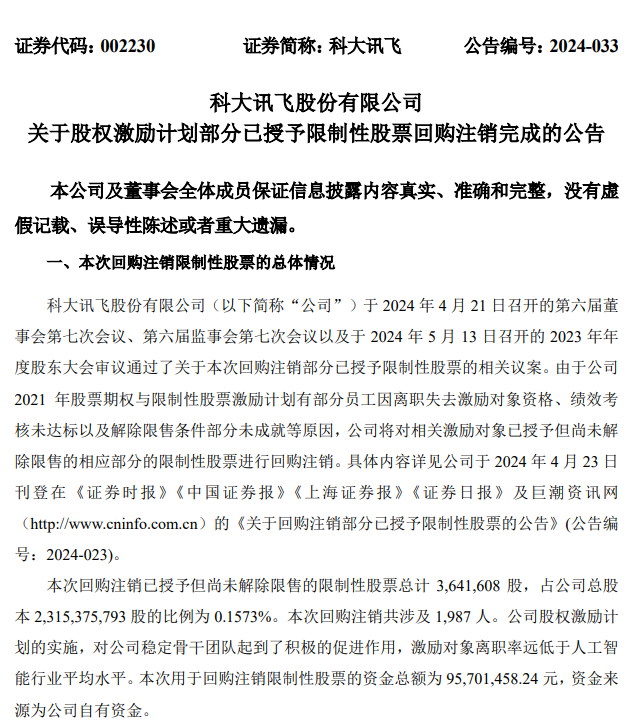 ICC訊 6月11日,科大訊飛發(fā)布關(guān)于股權(quán)激勵計劃部分已授予限制性股票回購注銷完成的公告稱,科大訊飛已完成本次回購注銷部分已授予限制性股票。