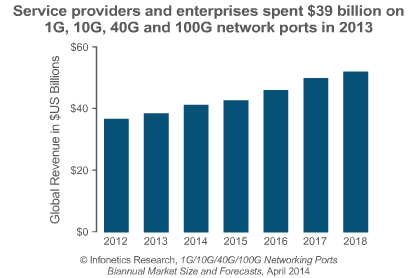 *2013年全球1G/10G/40G/100G網(wǎng)絡(luò)端口的收入較上年增長了5%,至390億美元,其中企業(yè)端口營收同比增長5%,而服務(wù)提供商口收入增長4%;