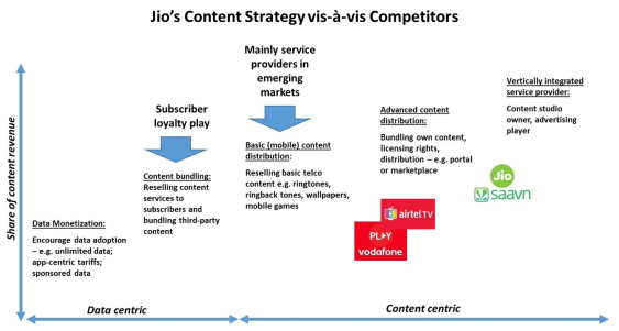 Reliance Jio不僅擁有整套電信業(yè)務(wù)服務(wù),還推出了音樂流媒體服務(wù)、直播電視服務(wù)和支付服務(wù)等業(yè)務(wù),全面完善了自身的網(wǎng)絡(luò)服務(wù)內(nèi)容。Jio在成立前期為了吸引用戶,還提供了額外的服務(wù),即用戶可以無限制的免費(fèi)的使用Jio的APP,在Jio官網(wǎng)上可以看到很多個(gè)APP,他們覆蓋了生活的方方面面,其中包括即將公開上市的音樂流媒體服務(wù)JioSaavn、點(diǎn)播實(shí)況電視服務(wù)JioTV和支付應(yīng)用程序JioMoney等,在過去的一年中,Jio還涉足了視頻游戲領(lǐng)域,推出了視頻通話助手以自動(dòng)實(shí)現(xiàn)客戶支持。Reliance Jio是內(nèi)容方面最先進(jìn)的移動(dòng)提供商之一,它使用其免費(fèi)娛樂應(yīng)用程序與競(jìng)爭(zhēng)對(duì)手區(qū)分開來,建立了用戶忠誠度并為未來的增長創(chuàng)造機(jī)會(huì),這也是全球其他運(yùn)營商一直想要做的事情。