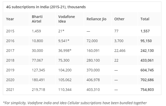 當(dāng)然,不管是Facebook或是其他的投資者看中的不僅僅是Jio的實(shí)力,更大的野心在于開拓印度這個(gè)具有潛力的市場(chǎng)。印度目前是僅次于中國的世界第二大電信市場(chǎng),在過去的15年中增長強(qiáng)勁。GSM協(xié)會(huì)與波士頓咨詢集團(tuán)(BCG)合作編寫的報(bào)告顯示,印度的移動(dòng)經(jīng)濟(jì)發(fā)展迅速,并將為印度的國內(nèi)生產(chǎn)總值(GDP)做出重大貢獻(xiàn)。在這個(gè)人口超過13億的國家,截至2019年12月,印度的電話訂戶總數(shù)和電話密度分別達(dá)到1,172.44百萬和88.56%。到20財(cái)年(2019年4月至9月),印度電信行業(yè)的總收入達(dá)到了121,527千萬盧比(173.9億美元),而印度的4G用戶仍有7.54億的增長空間。
