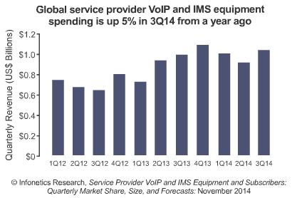 *2014年三季度,全球服務(wù)供應(yīng)商級VoIP和IMS市場季同比上漲5%,市場份額達到10億美元。