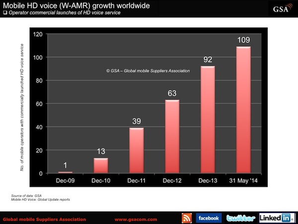 ICCSZ訊 近日,GSA(全球移動(dòng)供應(yīng)商協(xié)會(huì))確認(rèn)全球范圍內(nèi)已經(jīng)有109家移動(dòng)運(yùn)營(yíng)商在73個(gè)國(guó)家推出高清語音服務(wù)。2014年開始至今,已經(jīng)有17個(gè)國(guó)家推出高清語音服務(wù),Bahrain 和 Estonia是最近新推出高清語音服務(wù)的國(guó)家,那里的人已經(jīng)可以使用手機(jī)進(jìn)行高清語音通話。移動(dòng)運(yùn)營(yíng)商提供高清語音的數(shù)量比去年同期高36%以上。
