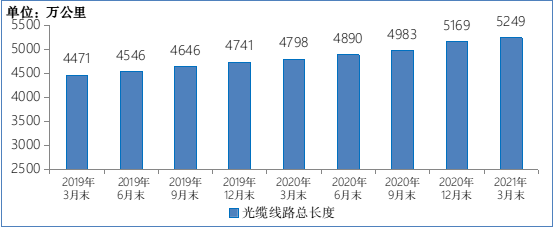2019-2021年3月末光纜線路總長度發(fā)展情況