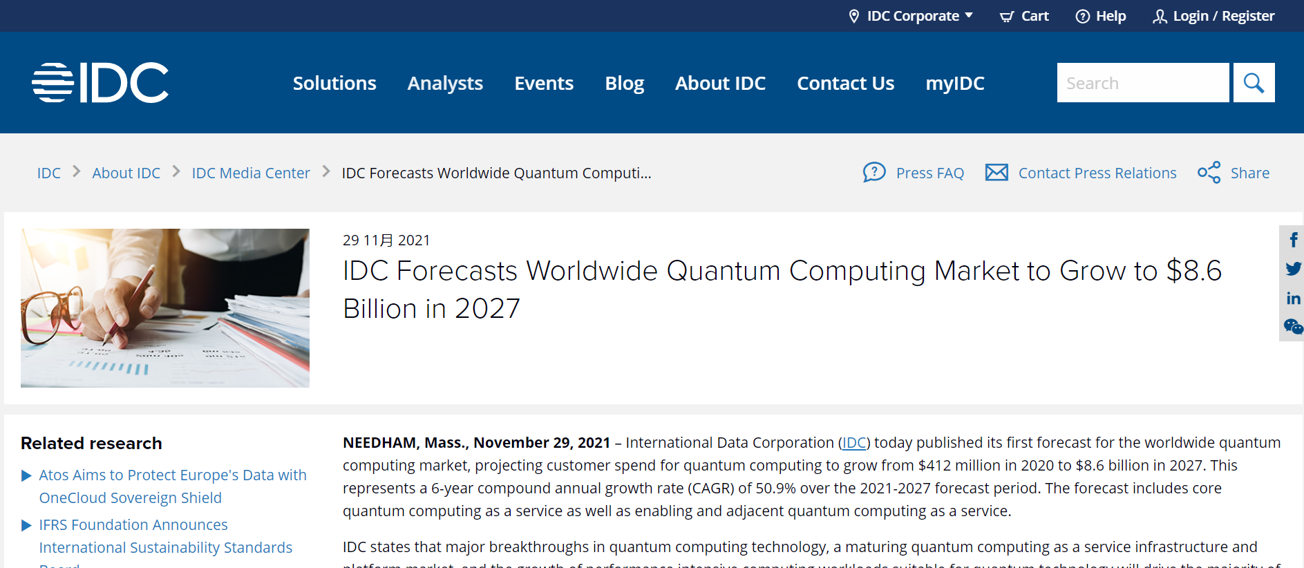 ICC訊 國(guó)際數(shù)據(jù)公司 (IDC) 發(fā)布了其對(duì)全球量子計(jì)算市場(chǎng)的首份預(yù)測(cè),預(yù)計(jì)客戶在量子計(jì)算方面的支出將從2020年的4.12億美元增長(zhǎng)至2027年的86億美元。量子計(jì)算市場(chǎng)在2021-2027年復(fù)合增長(zhǎng)率(CAGR)預(yù)計(jì)增長(zhǎng)到50.9%。該預(yù)測(cè)包括核心量子計(jì)算即服務(wù)以及啟用和相鄰量子計(jì)算即服務(wù)。