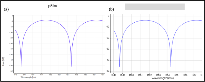 圖 1:仿真結(jié)果 (a) pSim, (b) 歐美鏈路仿真軟件; Transmission spectra for TW-MZM by using two DC source.