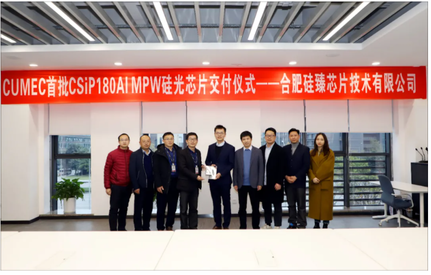 近日,CUMEC公司舉行“首批CSiP180Al MPW硅光芯片”交付儀式。儀式現(xiàn)場,公司副總經(jīng)理、工藝廠長劉嶸侃將芯片交付到合肥硅臻芯片技術(shù)有限公司CEO丁禹陽先生手中。公司副總經(jīng)理、高級總監(jiān)郭進,首席工藝師朱繼光、硅基光電子中心總監(jiān)馮俊波、工藝中心總監(jiān)王學毅、科技質(zhì)量部部長上官偉、項目經(jīng)理曹國威及科技質(zhì)量部相關(guān)人員參加交付儀式。