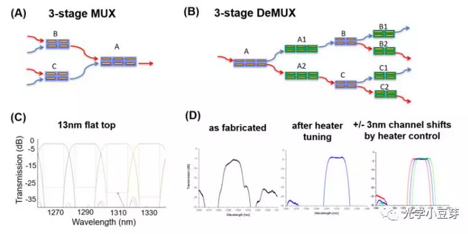 GF的Mux/DeMux采用級聯(lián)MZI的方案,并且借助于熱相移器的調(diào)控,串擾小于25dB, 單通道的插損為2.5dB。使用熱相移器,可以調(diào)控每個通道的中心波長,波長可變化+/- 3nm。