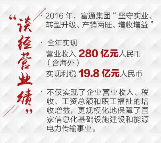 在剛剛過去的2016年,富通集團"堅守實業(yè)、轉型升級、產(chǎn)銷兩旺、增收增益",全年實現(xiàn)營業(yè)收入280億元人民幣(含海外),實現(xiàn)利稅19.8億元人民幣,不僅實現(xiàn)了企業(yè)營業(yè)收入、稅收、工資總額和職工福祉的增收增益,更規(guī)模化地保障了國家信息化基礎設施建設和能源電力傳輸事業(yè)。