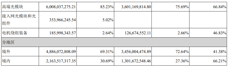 分行業(yè)來看,高端光通信收發(fā)模塊營收6,509,625,536.33元,同比增長40.57%;接入網(wǎng)光模塊和光組件營收353,966,245.54元,該部分收入為儲瀚科技貢獻。同時,公司海外市場占比為69.31%,境內(nèi)市場占比為30.69%