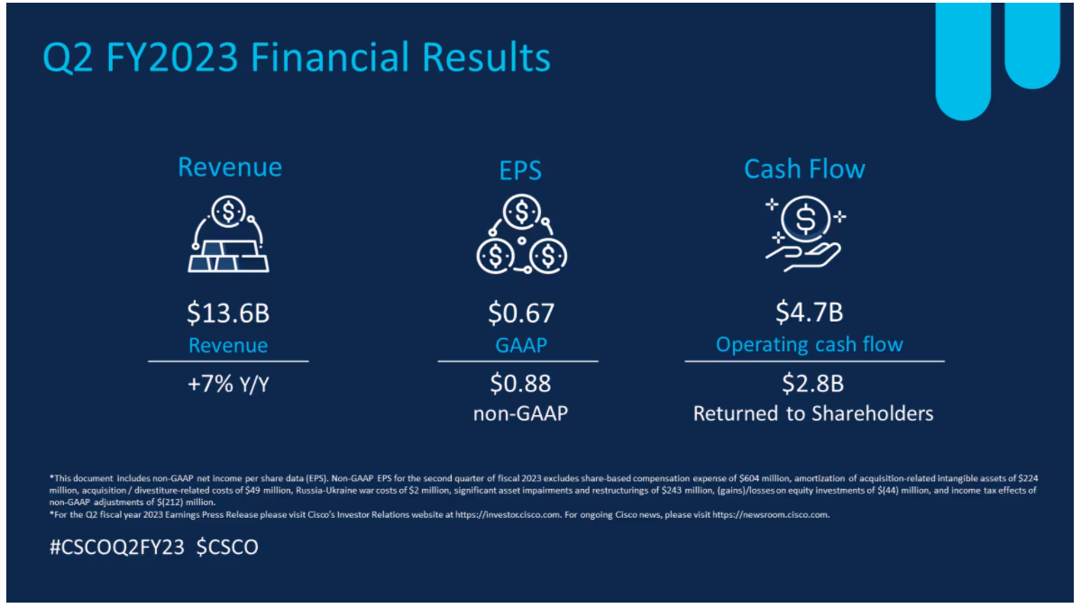 思科FY23Q2營收超預(yù)期同比增長7%達(dá)136億美元
