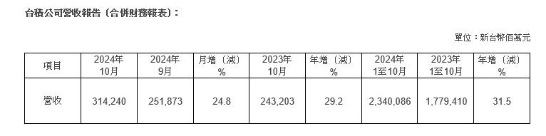 2024 年 10 月合并營收約為新臺幣 3142.4 億元(IT之家備注:當前約 698.74 億元人民幣),較上月增長了 24.8% ,較去年同期增長了 29.2% 。