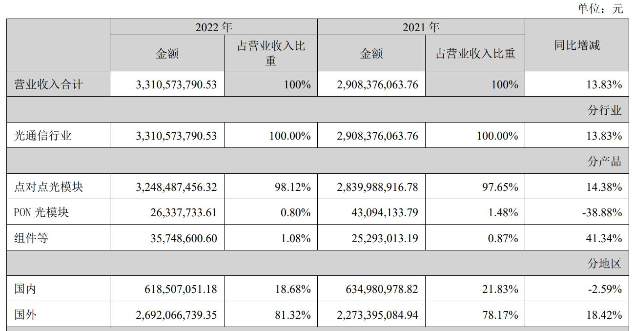 ICC訊 4月26日,成都新易盛通信技術股份有限公司(簡稱新易盛)發(fā)布2022年年度報告,報告期內(nèi)公司實現(xiàn)營業(yè)收入33.11億元,同比增長13.83%,歸屬于母公司股東的凈利潤9.04億元,同比增長36.51%。2022年新易盛抓住良好的市場發(fā)展機遇,新產(chǎn)品研發(fā)及市場開拓工作持續(xù)取得進展,客戶結構及產(chǎn)品結構進一步優(yōu)化,高速率光模塊、硅光模塊、相干光模塊等相關研發(fā)項目取得多項突破。