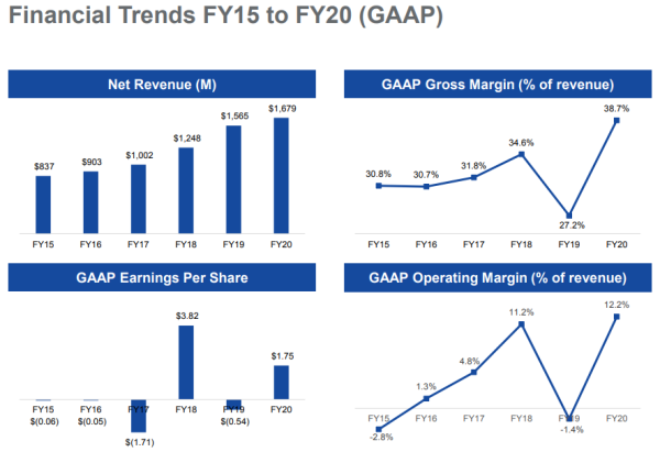 GAAP凈收入1.36億美元,或每股攤薄盈利1.75美元;上個財年GAAP凈虧損3790萬美元,或每股攤薄虧損54美分。上個財年虧損主要是由于收購Oclaro的影響(2018年12月10日完成收購)。
