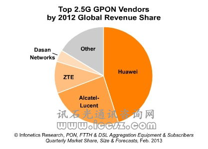 同時,2012年2.5G GPON設備上升30%,主要是由于中國。中國電信和中國聯(lián)通在技術選擇上的戲劇性變動,將其FTTH部署投資從EPON轉到GPON。