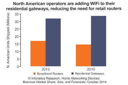 在北美和西歐寬帶市場較為成熟的地區(qū),服務(wù)供應(yīng)商正在部署家庭用的集成無線和有線技術(shù)的高端網(wǎng)關(guān)和機頂盒。然而,在寬帶新興市場,寬帶路由出貨量繼續(xù)看漲,以增加家庭WiFi。