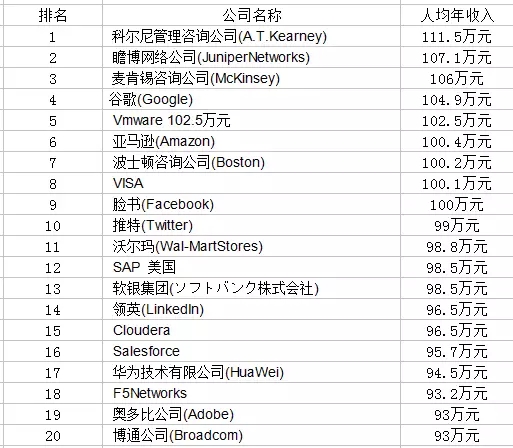 根據(jù)Busines提供的數(shù)據(jù)顯示,TOP 20中,芝加哥科爾尼管理咨詢公司111.5萬(wàn)元人均薪酬排在第一位,網(wǎng)絡(luò)設(shè)備制造商Juniper以107萬(wàn)人均收入緊跟其后……在這份榜單中,還有一些耳熟能詳?shù)?,亞馬遜、Facebook、Twitter、LinkedIn、Adobe等科技公司也都入圍。
