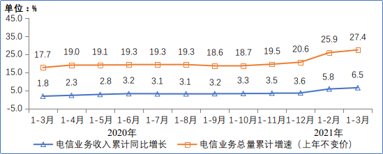 圖1 2020-2021年1-3月電信業(yè)務(wù)收入和電信業(yè)務(wù)總量累計(jì)增速