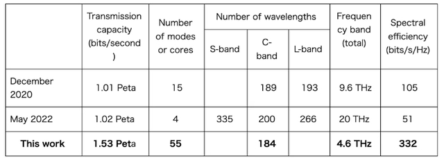這一成果是由日本國家信息與通信技術研究所(NICT,日本)網(wǎng)絡研究所的一組研究人員創(chuàng)造的,研究人員通過對 55 個不同光頻率的信息進行編碼(一種稱為多路復用的技術),實現(xiàn)了每秒約 1.53 Pb 的帶寬。