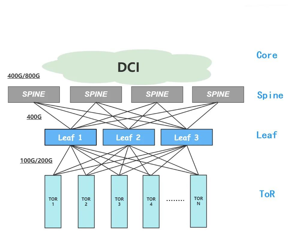 數(shù)據(jù)中心組網(wǎng)示意圖(典型的三級CLOS組網(wǎng))