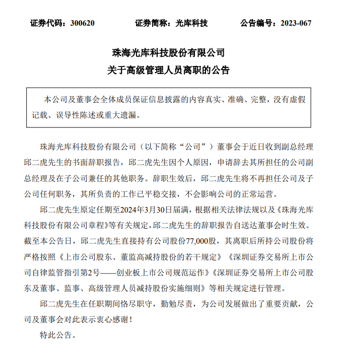 ICC訊 11月28日,光庫(kù)科技發(fā)布公告稱,董事會(huì)于近日收到副總經(jīng)理邱二虎的書面辭職報(bào)告,邱二虎因個(gè)人原因,申請(qǐng)辭去其所擔(dān)任的公司副總經(jīng)理及在子公司兼任的其他職務(wù)。辭職生效后,邱二虎將不再擔(dān)任公司及子公司任何職務(wù),其所負(fù)責(zé)的工作已平穩(wěn)交接,不會(huì)影響公司的正常運(yùn)營(yíng)。截至本公告日,邱二虎直接持有公司股份7.7萬(wàn)股公司股份。