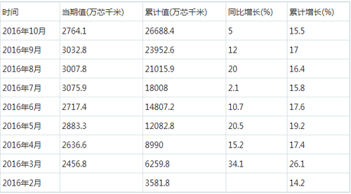 2016年1-10月我國光纜產(chǎn)量數(shù)據(jù)統(tǒng)計(jì)