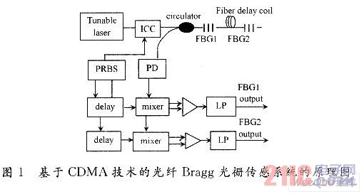 圖1是基于CDMA技術(shù)的光纖Bragg光柵傳感系統(tǒng)原理圖。光源的輸出受偽隨機(jī)序列碼(PRBS)的調(diào)制,F(xiàn)BG傳感陣列對(duì)一個(gè)給定的PRBS響應(yīng)與延遲一定時(shí)間的同一個(gè)PRBS進(jìn)行相關(guān)運(yùn)算,其結(jié)果經(jīng)低通濾波器濾波后即可得到某一個(gè)特定傳感器上返回的波長(zhǎng)編碼信號(hào)。經(jīng)過(guò)預(yù)先設(shè)置傳感器位置,再經(jīng)調(diào)制后,光源輸出信號(hào)到達(dá)某一傳感器并返回到探測(cè)器所需的時(shí)間是確定的,因此通過(guò)適當(dāng)選擇送到相關(guān)器的PRBS的延遲時(shí)間,就可確定相關(guān)運(yùn)算結(jié)果來(lái)自于哪個(gè)傳感器,即可在獲得傳感信息的同時(shí)實(shí)現(xiàn)尋址。