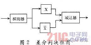 在此,對(duì)信號(hào)進(jìn)行差分檢測(cè),如圖2所示。圖中X表示序列自相關(guān)解碼器;X表示序列與其共軛序列相關(guān)解碼器。對(duì)于m序列調(diào)制信號(hào),在一個(gè)周期內(nèi)對(duì)確定的延遲時(shí)間,X為最大值(歸一化后為1)時(shí),X將取到最小值,這樣在判決端很容易判別信號(hào)。