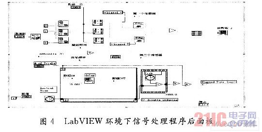 實(shí)驗(yàn)中,將采集到的信號(hào)在虛擬儀器軟件LabVIEW中進(jìn)行處理。具體處理如下所述:采集卡的3個(gè)通道中,第1,2兩個(gè)通道采集DSP通過(guò)緩沖驅(qū)動(dòng)電路后的信號(hào)(其中一路信號(hào)需要將其延時(shí));第3個(gè)通道采集送光電探測(cè)器探測(cè)到的信號(hào)。將3個(gè)通道的信號(hào)在同步節(jié)點(diǎn)下送入系統(tǒng)程序,程序后面板程序如圖4所示。