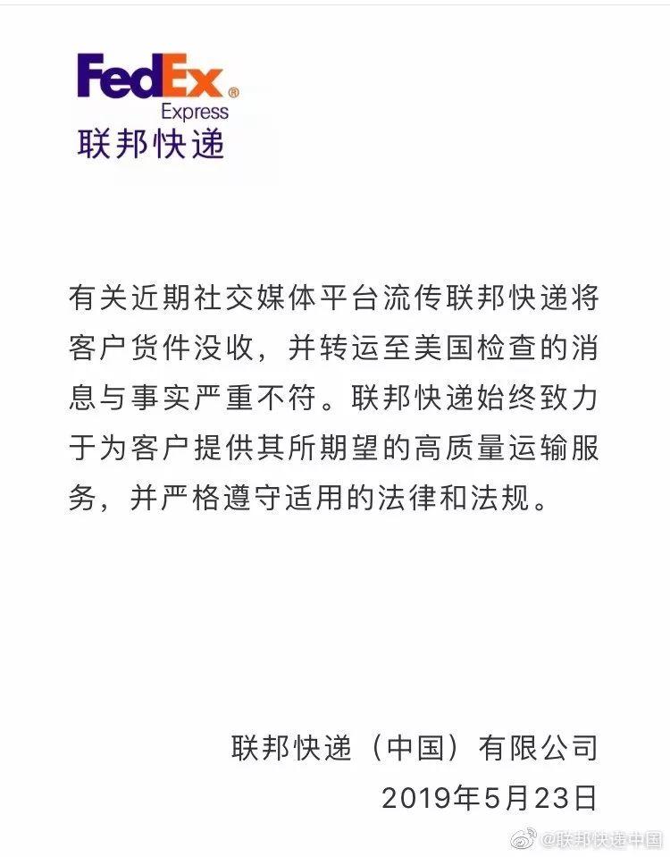 而早在本月23日,聯(lián)邦快遞曾在其官方微博表示,有關(guān)近期社交媒體平臺流傳聯(lián)邦快遞將客戶貨件沒收,并轉(zhuǎn)運(yùn)至美國檢查的消息與事實(shí)嚴(yán)重不符。