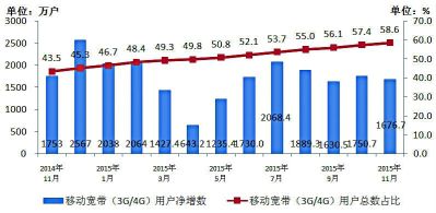 1~11月,移動(dòng)電話用戶規(guī)模達(dá)到13.04億。其中,移動(dòng)寬帶用戶(即3G和4G用戶)累計(jì)凈增1.8億戶,總數(shù)達(dá)到7.6億戶,占比達(dá)58.6%。