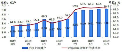 圖4 2014年~2015年11月手機(jī)上網(wǎng)用戶和對(duì)移動(dòng)電話用戶滲透率情況