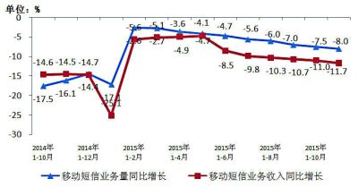 圖6 2014年~2015年11月移動(dòng)短信業(yè)務(wù)量和移動(dòng)短信收入同比增長(zhǎng)情況