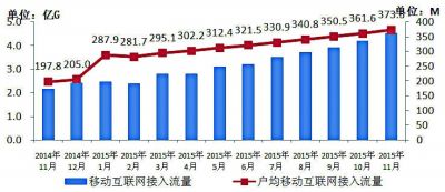 圖7 2014年~2015年11月移動(dòng)互聯(lián)網(wǎng)接入流量和戶均流量比較