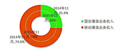 圖8 2015年11月電信業(yè)務(wù)收入結(jié)構(gòu)占比情況(固定和移動(dòng))