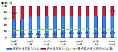 圖9 2014年~2015年11月話音、非話音、移動(dòng)數(shù)據(jù)及互聯(lián)網(wǎng)收入占比情況