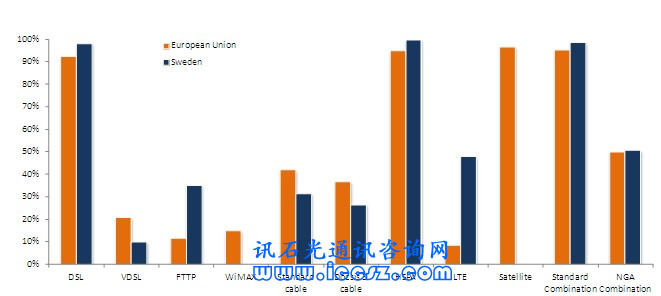 《2011歐洲寬帶覆蓋》調(diào)研報(bào)告顯示,瑞典基本寬帶覆蓋率(至少提供144kbps的服務(wù),只要他們?cè)敢猓┻_(dá)99%,超高速寬帶(也稱為NGA,即下一代接入)覆蓋接近51%。在調(diào)研的29個(gè)國(guó)家中(歐盟27國(guó)和挪威、冰島),96%能夠獲得基本寬帶,超過50%(一半國(guó)家走向2020數(shù)字天堂目標(biāo))能夠獲得超高速。