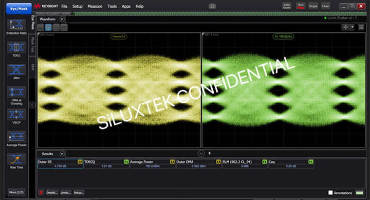 展會(huì)現(xiàn)場(chǎng)演示的DR8 800G硅光模塊,其性能極大超越了IEEE P802.3df D2.0對(duì)800GBASE-DR8的光接口規(guī)范要求, TX眼圖如下: