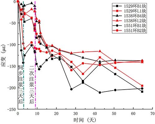 當(dāng)盾構(gòu)機(jī)掘進(jìn)到1532環(huán)管片位置(距離1529環(huán)4.5米),開始采集1529環(huán)管片的應(yīng)變數(shù)據(jù),初期每1天讀取1次數(shù)據(jù);
