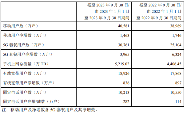 移動通信服務方面,中國電信不斷優(yōu)化5G網絡覆蓋,圍繞個人數(shù)字化應用需求,加快推進5G應用AI智能化升級,推動用戶規(guī)模和價值實現(xiàn)穩(wěn)健增長。2023年前三季度,移動通信服務收入為1519.16億元,同比增長2.4%,移動用戶凈增1,463萬戶,達到約4.06億戶,5G套餐用戶凈增3965萬戶,達到約3.08億戶,滲透率達到75.8%,移動用戶ARPU為45.6元,同比增長0.2%。