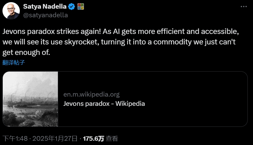 非常湊巧的是,微軟CEO納德拉上周末也在社交媒體上表示:杰文斯悖論再次出現(xiàn)!隨著人工智能變得更高效和更容易獲取,我們將看到它的使用激增,變成難以滿足需求的商品。