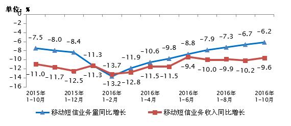 圖7 2015-2016年10月移動(dòng)短信業(yè)務(wù)量和收入同比增長(zhǎng)情況
