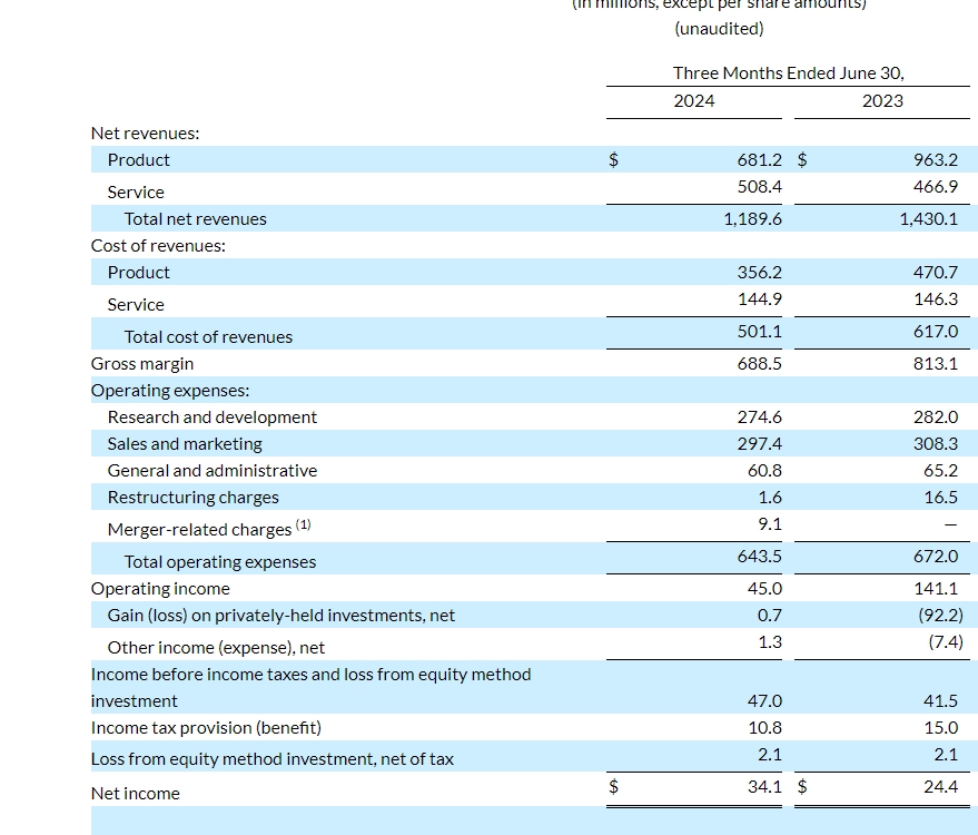 2024年第二季度,Juniper網(wǎng)絡(luò)營收11.9億美元,同比下滑16.82%,環(huán)比增長4%。GAAP凈收入3410萬美元,同比增長40%,或者每股凈收入0.1美元。非GAAP凈收入1.02億美元,同比下滑46%,環(huán)比增長5%。