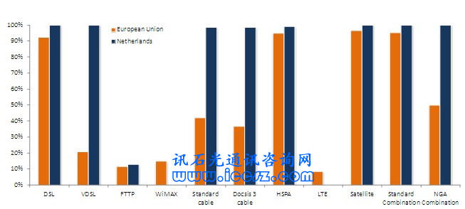 《2011歐洲寬帶覆蓋》調(diào)研報告顯示,荷蘭幾乎實現(xiàn)了寬帶全覆蓋。不僅僅是100%的基本寬帶覆蓋(至少提供144kbps的服務,只要他們愿意),而且超高速寬帶(也稱為NGA,即下一代接入)覆蓋也達到了100%。在調(diào)研的29個國家中(歐盟27國和挪威、冰島),96%能夠獲得基本寬帶,超過50%(一半國家走向2020數(shù)字天堂目標)能夠獲得超高速。