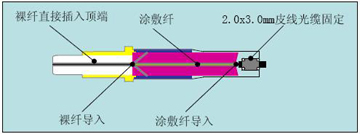 b)預(yù)埋纖結(jié)構(gòu) 預(yù)埋纖結(jié)構(gòu)采用的是在工廠將一段裸纖預(yù)先置入陶瓷插芯內(nèi),并將頂端進(jìn)行了研磨,操作者在現(xiàn)場只需要將另一端切割好光纖后插入即可;由于預(yù)埋結(jié)構(gòu)前面預(yù)埋纖工廠研磨且對(duì)接處填充匹配液,不過分依賴光纖端面切割的平整度,大大降低了對(duì)操作者熟練程度的要求;由于接頭的端面采用的是預(yù)先研磨的工藝,因此回波損耗指標(biāo)好;產(chǎn)品結(jié)構(gòu)原理如下: