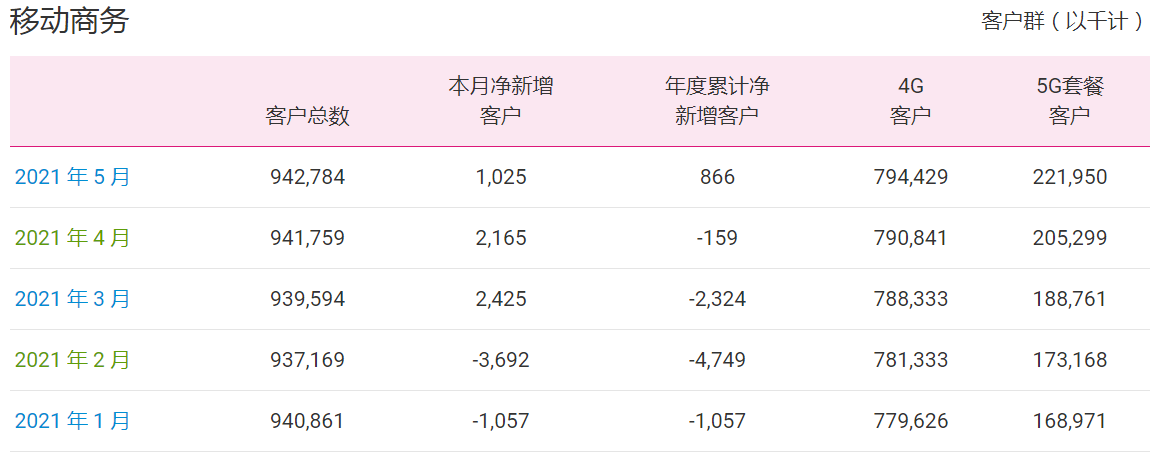 ICC訊 (編輯:Anton)中國(guó)移動(dòng)近日公布了2021年5月份運(yùn)營(yíng)數(shù)據(jù),移動(dòng)業(yè)務(wù)客戶總數(shù)新增102.5萬(wàn)戶,當(dāng)月5G套餐客戶數(shù)新增1665.1萬(wàn)戶。截至2021年5月末,移動(dòng)客戶總數(shù)為9.42784億戶,5G套餐客戶數(shù)達(dá)2.2195億戶。4G客戶新增86.6萬(wàn)戶,累計(jì)達(dá)7.94429億戶。